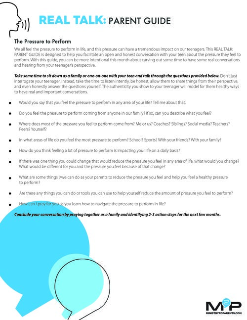 EXCERPT FROM MinistrytoParents.com PARENT GUIDE: We all feel the pressure to perform in life, and this pressure can have a tremendous impact on our teenagers. This REAL TALK:
