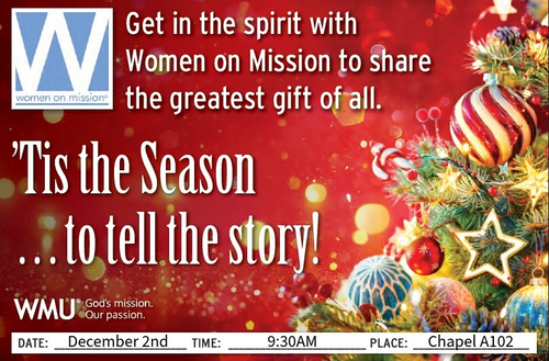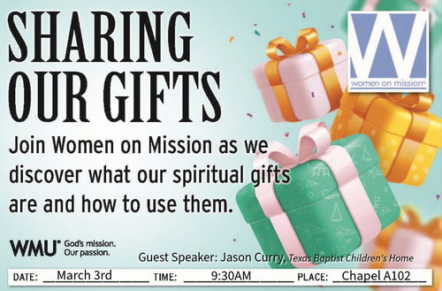Women on Mission is under the umbrella of W.M.U. of Texas. We meet the first Tuesday of every month in the Chapel Room A102 at 9:30 am. Meetings consist of guest speakers , bible study, missionary spotlight and prayer for missionaries. We have mission projects both for our community and other opportunities outside our area. Women of all ages are welcome. For more information regarding Women on Mission, please contact the Director, Debbie Burden (903-570-4706).